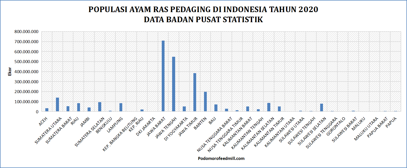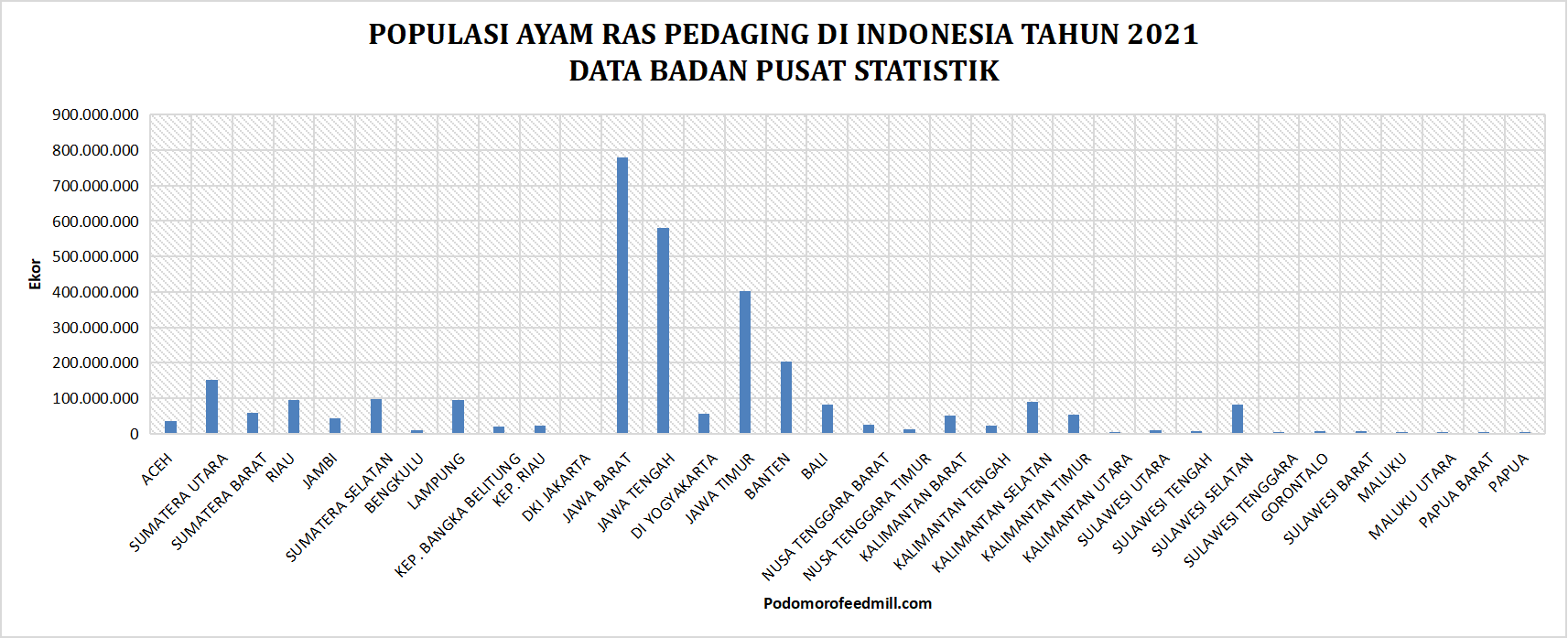 Daging ayam menjadi salah satu kebutuhan pokok pangan hasil peternakan yang banyak digemari masyarakat Indonesia. Setiap tahun konsumsi daging ayam ras pun terus meningkat. Dengan semakin tingginya permintaan terhadap daging ayam, semakin banyak pula masyarakat yang melirik bisnis ternak ayam ras pedaging tersebut. Hampir semua daerah di Indonesia terdapat budidaya ayam ras pedaging. Badan Pusat Statistik (BPS) mencatat, terdapat lima provinsi tertinggi populasi ayam ras pedaging di Indonesia.