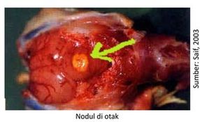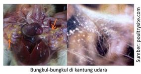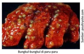 Ketika dilakukan bedah ayam yang sakit akan ditemukan eksudat caseosa (cairan yang dikeluarkan dari pori-pori luka berwarna putih kekuningan) pada percabangan trakea, dan nodul (benjolan) pada otak dan hati. Selain itu ditemukannya bungkul-bungkul (benjolan) di kantong udara dan paru-paru. Sering dijumpai cairan bernanah yang berwarna hijau kekuningan, selaput kantung udara menebal dengan pertumbuhan jamur berwarna putih pada permukaannya.