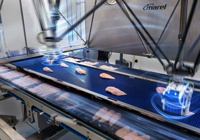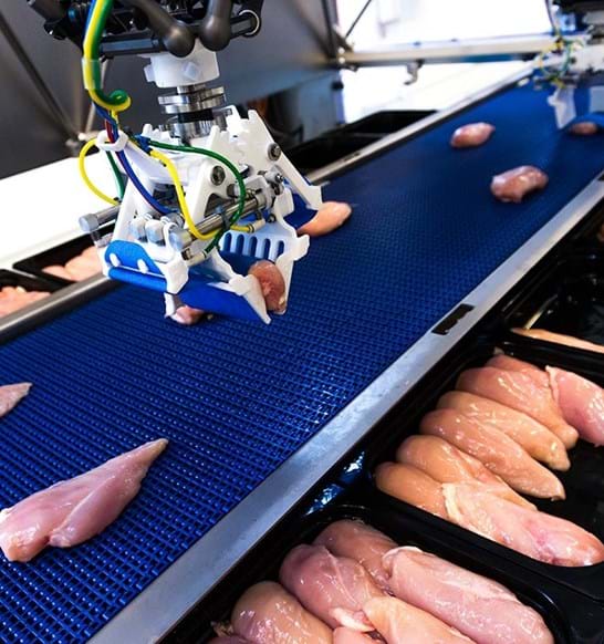 Pada industri ayam pedaging, robot biasa digunakan untuk melakukan pemindahan daging, memotong daging, mengelompokkan daging dan mendeteksi karkas yang rusak. RoboBathcer flex yang dikembangkan oleh perusahaan Marel asal Belanda dapat memindahkan dan mengatur daging fillet hingga 300pcs per menit.