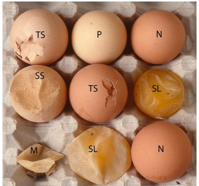 TS= kerabang tipis; P= pucat, SS= kerabang telur halus; SL= telur dengan kerabang yang rusak (tidak sempurna); M= membran remnant kerabang; N= telur coklat normal (Fitzgerald et al., 2019).