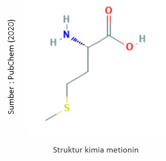 b. Metionin adalah asam amino bersulfur dengan fungsi utama sama seperti lisin. Molekul yang mengandung sulfur memainkan peran penting bagi tubuh, termasuk perlindungan jaringan, modifikasi DNA, dan pemeliharaan fungsi sel. Disamping itu, metionin pun merupakan komponen utama dari bulu unggas. Metionin bekerja sama dengan sistein (asam amino non esensial) dalam proses pembentukan bulu. Menurut para ahli komposisi asam amino bulu terdiri dari 0,70% metionin dan 5,50% sistein. Defisiensi (kekurangan) metionin dapat menyebabkan pertumbuhan bulu yang lambat dan meningkatkan risiko mematuk bulu pada ayam.